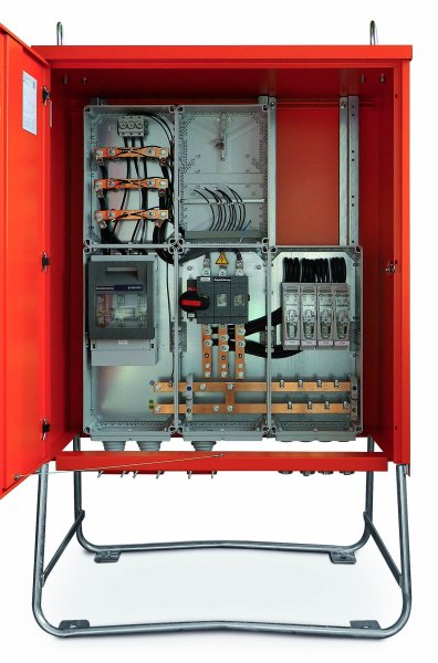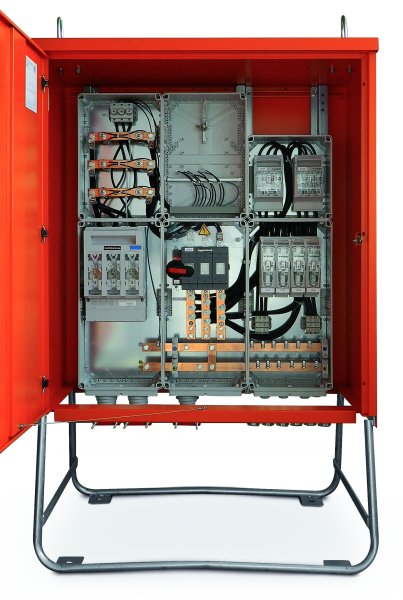Anschlussschränke verfügen über eine Anschlusssicherung als NH-Lasttrenner, einer Messeinrichtung nach DIN 43870 in Schutzart IP 54, plombierbar und mit separat abnehmbarer Zählerabdeckung sowie über eine Hauptsicherung als NH-Lasttrenn-schalter mit Sicherung und ggf. über mehrere Abgänge. Sämtliche Einbauten sind schutzisoliert in Schutzart IP 54.